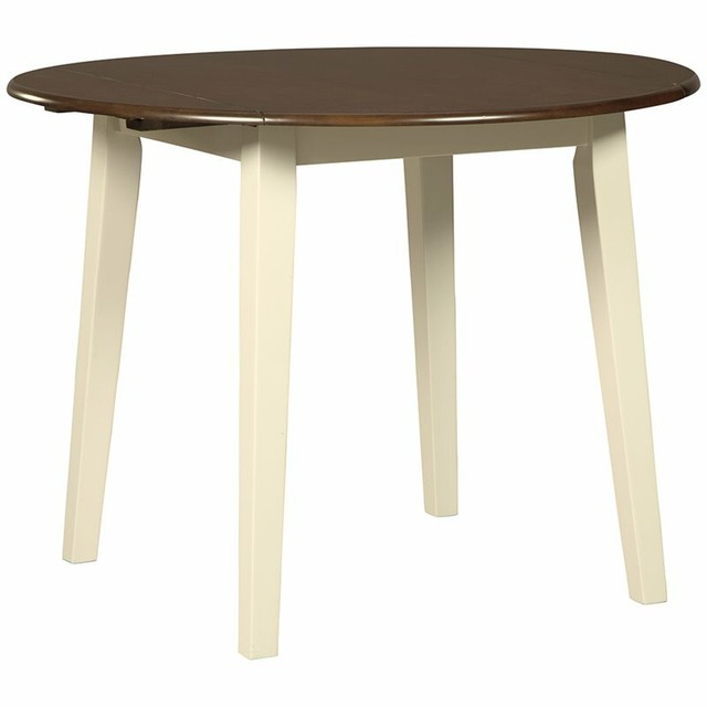 Ashley furniture drop leaf dining table. Dining room tables by ashley furniture homestore from the latest styles of dining room tables to bar stools ashley homestore combines the latest trends with technology to give you the very best for your home. Two tone gently distressed finish of weathered oak over antique white doubles up on character that s enhanced with a plank effect top. Round table features drop leaves for a flawless dining experience in compact homes. When accompanied by the matching ladderback chairs what a storybook scene.