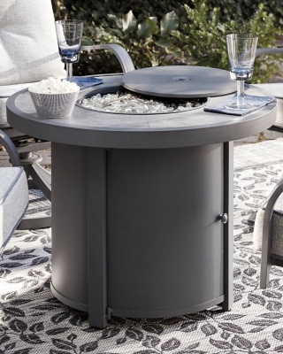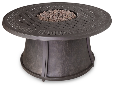 Stainless steel burner with glass beads adds a captivating element sure to wow. Welcome to our website. Included burner cover transforms the fire table into an expansive coffee table. Ashley furniture signature design castle island outdoor round fire pit table product description the clever design maximizes practicality while still emphasizing the importance of setting the mood durable design.