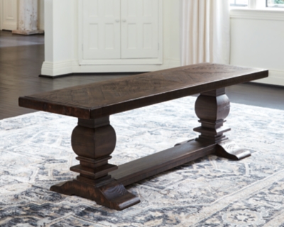The bench has dramatically turned legs and a stretcher while the. The richly rustic finish is enhanced by a herringbone inlay pattern on top. Hillcott brown dining table. Double pedestal base with stretcher is an inspired choice for a hearty homey aesthetic.