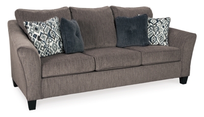 Its textured chenille with solid microfiber upholstery provides a luxuriously soft feel that s inviting. Frame constructed of hardwoods and plywoods. Nemoli slate sofa from ashley furniture. The on trend slate colored upholstery offers a perfect background for the two decorative pillows to pop with beauty.
