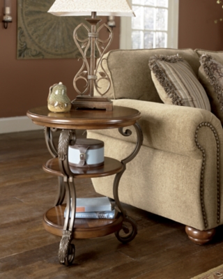 Ashley furniture nestor end table. With a scrolling bronze metal finish and warm burnished finish table top the nestor end table from ashley offers the elegance of traditional design into your living room. Bathed in a toasty finish with oil rubbed accents the tabletop and bottom shelf are top shelf for warmth and high end rustic appeal. Lower fixed shelf is perfect for displaying your home accents. Whether you re looking for side tables for the living room or an end table in the den we have something just right for you.