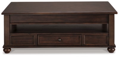 Ashley furniture goes the extra mile to package protect and deliver your purchase in a timely manner. Porter rustic brown lift top cocktail table description. The porter lift top cocktail by ashley furniture brings traditional style w modern feel to your space. Dark finish pairs nicely with brushed nickel tone hardware while roomy lower shelf offers ample space and keeps tabletop free of clutter.