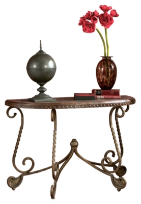 Rugged elements are beautifully softened by a scrolled serpentine base in an antiqued hue for a sense of refinement. Rich with the beauty of old world design the grand traditional style of the rafferty accent table collection transforms any living area with a comforting elegance. Accent the beauty of any home with the old world elegance of the rafferty accent table collection. Signature design by ashley right arm facing rafferty sofa table dark brown by ashley furniture.