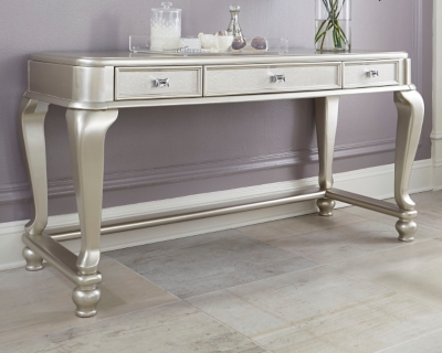 Ashley furniture coralayne bedroom vanity in silver. A matching stool has a plush cushioned top and a neutral. The large tabletop is ideal for storing perfume bottles and trinkets while a single drawer provides space to keep small items organized. An ashley furniture bedroom vanity integrates a sense of elegance in your space without breaking the bank thanks to our wide selection of countertop materials and styles.