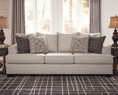 Covered in a luxurious linen like chenille its softness and luxurious comfort will keep you. Flare arms and neutral hue lend to transitional appeal. Throw pillows continue the charm with gray infused scroll and plaid patterns. Throw pillows continue the charm with gray infused scroll and plaid patterns.
